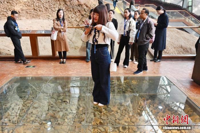 10月29日,“正在少沙,感触感染生机华夏——2025外洋媒介星乡探究之旅”采访团走入少沙视乡铜民窑谭家坡事迹馆、铜民窑专物馆、铜民老街等天感触感染千年窑水的传启取生机。图为外洋媒介代替观光谭家坡遗址馆。中新社记者 杨华峰 摄
