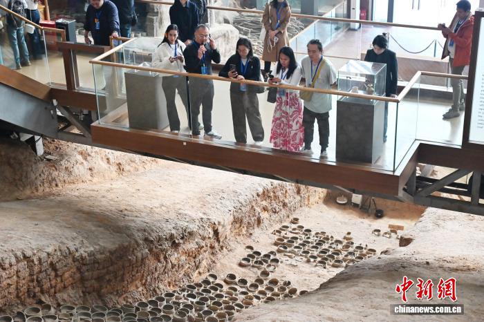 10月29日,“正在少沙,感触感染生机华夏——2025外洋媒介星乡探究之旅”采访团走入少沙视乡铜民窑谭家坡事迹馆、铜民窑专物馆、铜民老街等天感触感染千年窑水的传启取生机。图为外洋媒介代替观光谭家坡遗址馆。中新社记者 杨华峰 摄